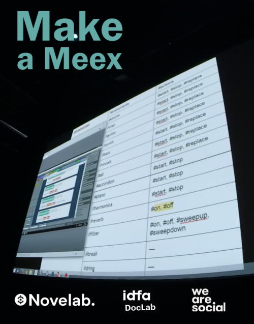 Make a Meex est une installation éphémère interactive à destination des événements publics regroupant 20 à 200 personnes. Meex permet de créer de la musique collaborative en postant des messages sur Twitter/X. Un artiste compose des boucles musicales que les utilisateurs activent via des hashtags depuis leur smartphone. Elles se mêlent, s’additionnent, se soustraient